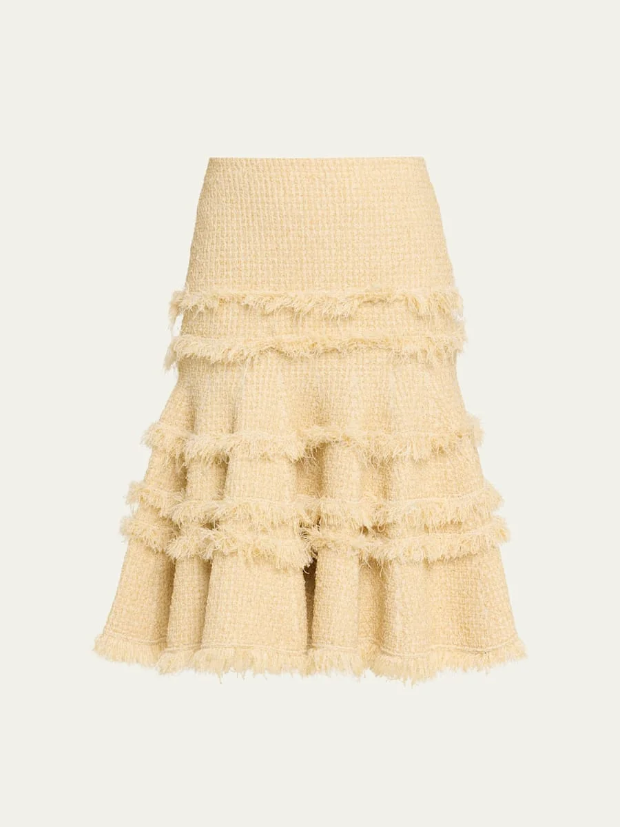 Ulla Johnson "Andi" tweed midi skirt adorned with a tiered silhouette and frayed trim High rise Flared silhouette Hem falls below the knee Pull-on style Polyester/Promodal® rayon/nylon/polyamide Dry clean Imported Online Inquiries: BGS21_T6YR5| Store Inquiries: #5060394