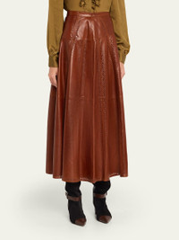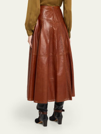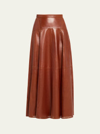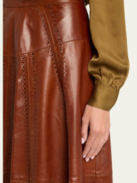 Ulla Johnson "Aninda" smooth leather midi skirt elevated with laser-cut trim High rise A-line silhouette Hem falls below the knee Center back zip Leather Leather method dry cleaning Imported Online Inquiries: BGS21_T6YRK| Store Inquiries: #5060409