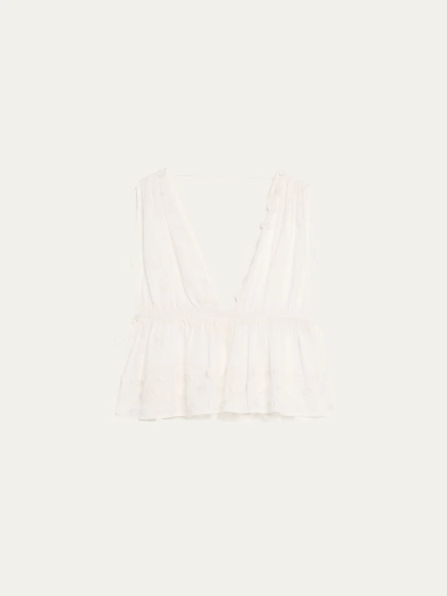 Ulla Johnson "Anya" coverup top with embroidered trim detailing and self-ties throughout Plunging V neckline Sleeveless Relaxed fit Hip length Slipover style Cotton Imported Online Inquiries: BGS21_T6NH6| Store Inquiries: #5021038