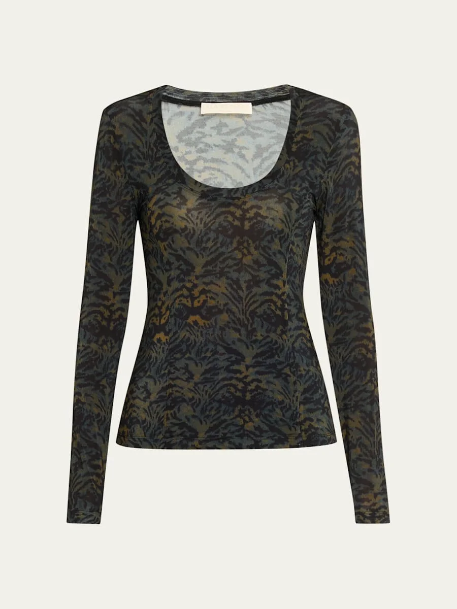 Ulla Johnson "Aris" soft jersey top decorated in an intricate paisley-print Scoop neckline Long sleeves Easy fit Hem sits at the hip Pullover style Rayon/cellulose acetate/elastane Imported Online Inquiries: BGS21_T6YRM| Store Inquiries: #5060412