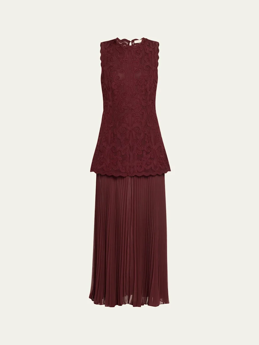 Ulla Johnson "Auryn" midi dress elevated with an applique bodice and finished with a pleated silk skirt Crew neckline Sleeveless Column silhouette Hem falls below the knee Back keyhole closure Silk Imported Please Note: The belt is not included. Online Inquiries: BGS21_T6YRB| Store Inquiries: #5060401