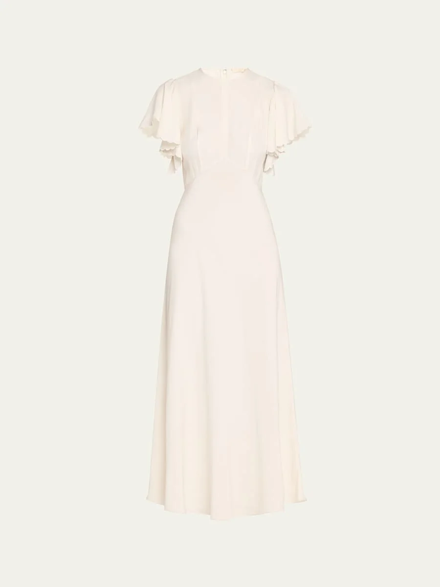 Ulla Johnson "Blithe" midi dress featuring scalloped flutter sleeves Crew neckline A-line silhouette Hem falls below the knee Center back zip Viscose Dry clean Imported Online Inquiries: BGS21_T6XPK| Store Inquiries: #5021329