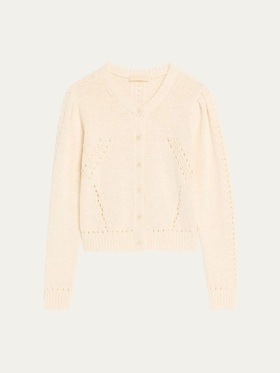 Delphina Pointelle Knit Puff-Sleeve Crewneck Cardigan
