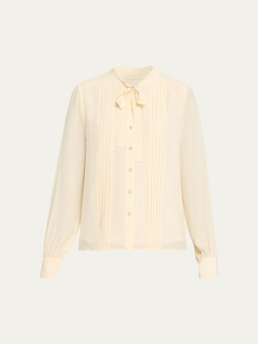 Crafted from luxurious silk, the "Delvine" blouse by Ulla Johnson is adorned with pleats and a delicate tie neck for a feminine touch Crew neckline Long sleeves with button cuffs Classic fit Hem falls to the hip Buttonfront Silk Imported