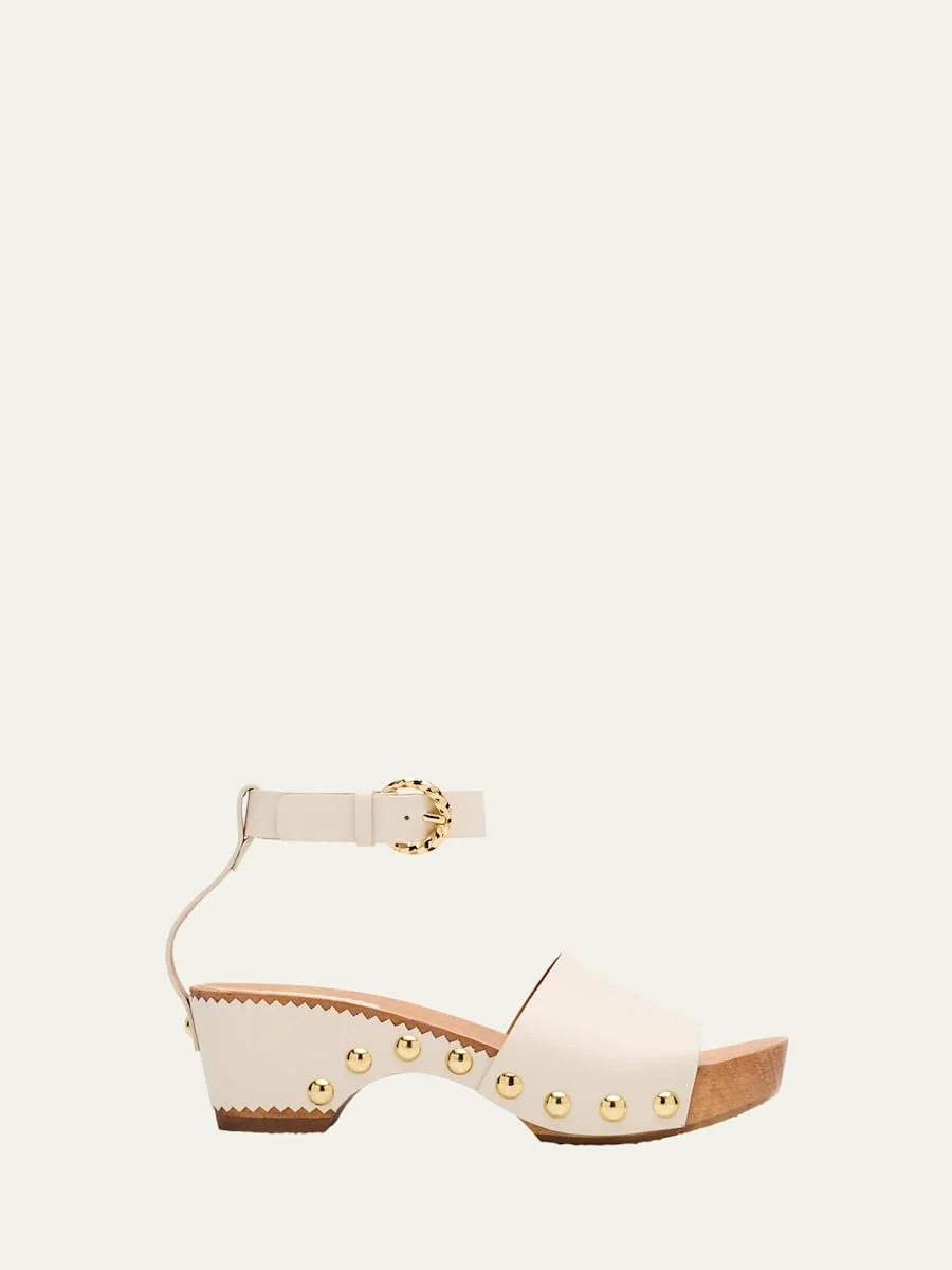 Ulla Johnson smooth calf leather clog sandals with golden stud detailing 1.50 in / 40 mm wooden block heel Open toe Adjustable ankle strap Rubber outsole Lining: Leather Made in Spain Online Inquiries: BGS21_X6TXP| Store Inquiries: #4967060