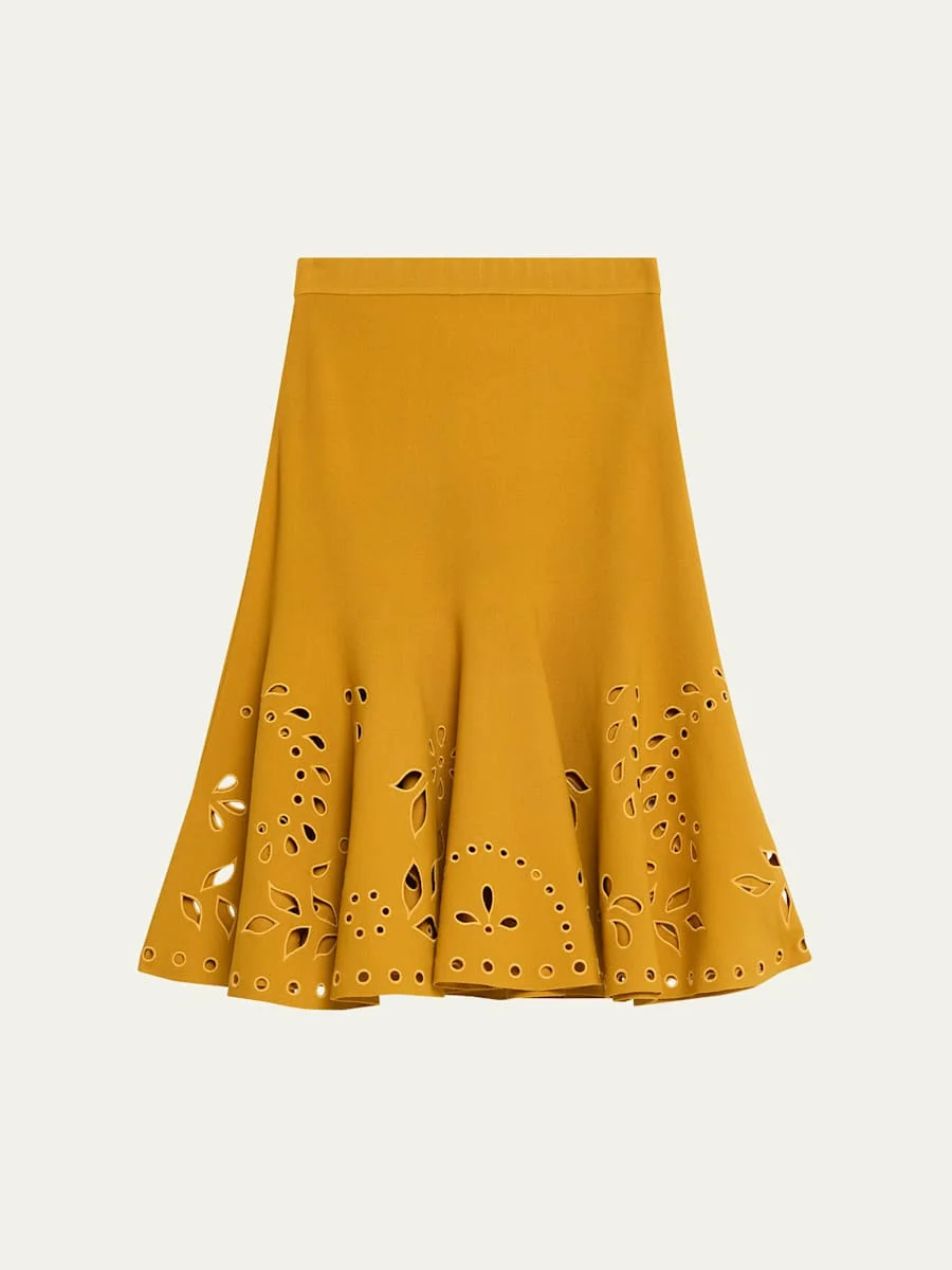 Crafted from an eyelet knit, the "Fiorella" midi skirt by Ulla Johnson adds a vintage-inspired touch to an overall timeless silhouette. High rise Elastic waistband A-line silhouette Hem falls below the knee Pull-on style Viscose/polyester/spandex Dry clean Imported Online Inquiries: BGS21_T6PUJ| Store Inquiries: #5021367