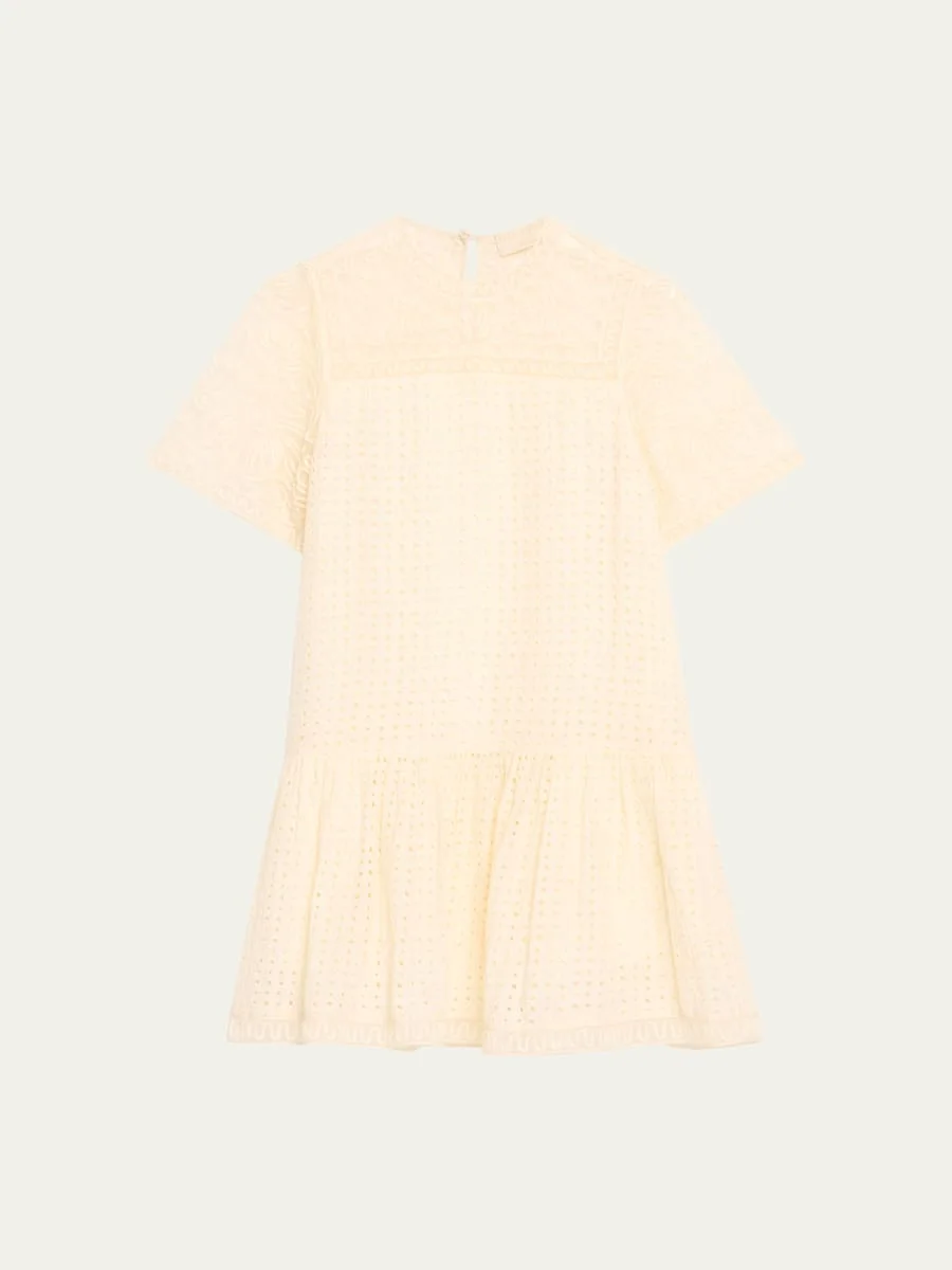 Ulla Johnson "Gabi" embroidered drop-waist dress with mesh paneling Crew neckline Short sleeves Hem falls above the knee A-line silhouette Back button/loop closure Cotton/silk Dry clean, hand wash Imported Online Inquiries: BGS21_T6BCN| Store Inquiries: #4952735