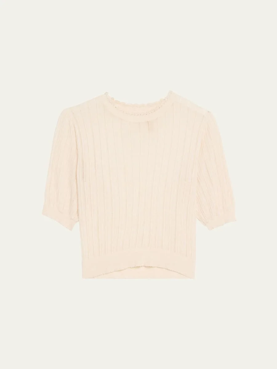 Crafted in lightweight pointelle knit with subtle openwork, the "Gemma" top by Ulla Johnson is finished with handmade crochet trim for a delicate touch. Crew neckline Short puff sleeves Slim fit Hem sits at the hip Pullover style Rayon Dry clean only Imported