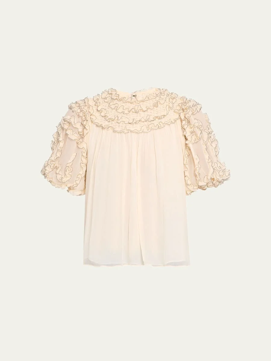 Ulla Johnson "Isolda" luxurious silk blouse elevated with smocking and ruffles High neckline Short sleeves Classic fit Hem falls to the hip Pullover style Silk Dry clean Imported Online Inquiries: BGS21_T6YS1| Store Inquiries: #5060430