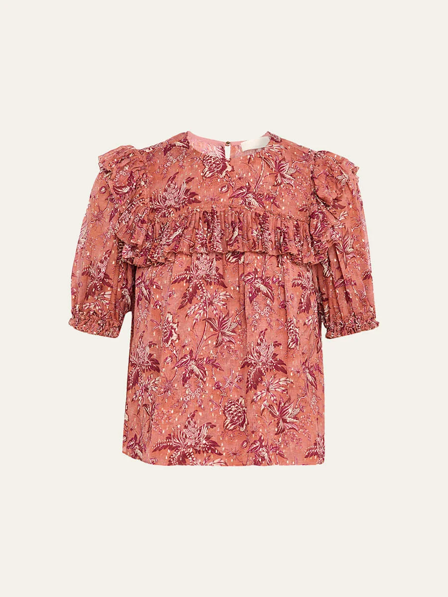 Crafted in luxurious silk, the "Jodie" top by Ulla Johnson is adorned with ruffles and features an allover floral print. Crew neckline Short sleeves Classic fit Hem falls to the hip Back keyhole closure Silk Dry clean only Imported