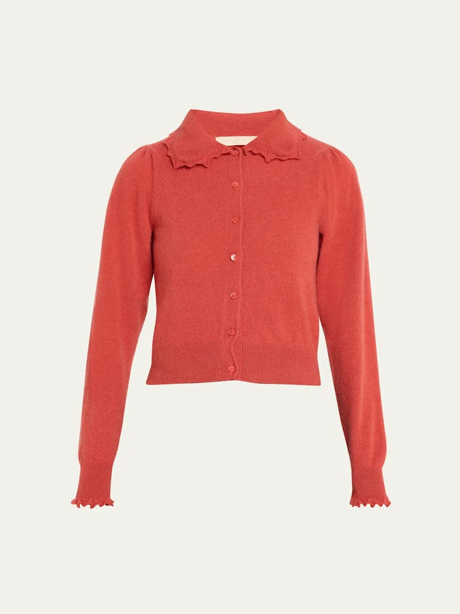 Ulla Johnson "Kalila" cardigan is crafted from a soft cashmere knit featuring gathered shoulders and delicate frills along the collar and cuffs. Peter Pan collar; button front Long puff sleeves Slim fit Cropped length Ribbed cuffs and hem Cashmere Imported