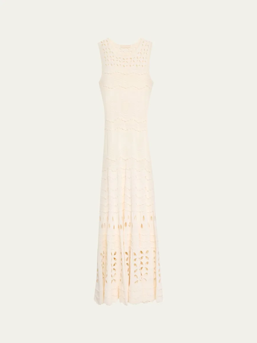 Adorned with openwork details, the "Lakshmi" dress by Ulla Johnson is crafted from ultrasoft knit and features delicate scalloped trim that defines the silhouette. Crew neckline Sleeveless Fitandflare silhouette Full length Slipover style Viscose/nylon/polyamide/polyester Dry clean only Made in Poland SIZE amp; FITModel measurements: 5'10" tall Model is wearing a US size 4/Small