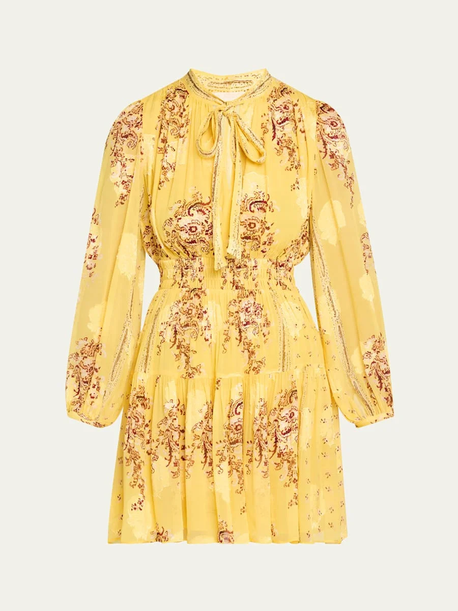 Ulla Johnson "Maris" printed silk mini dress embellished with a self-tie neckline Long sleeves with elastic cuffs Smocked waist A-line silhouette Hem falls above the knee Slipover style Silk Dry clean Imported Online Inquiries: BGS21_T6PUB| Store Inquiries: #5021335
