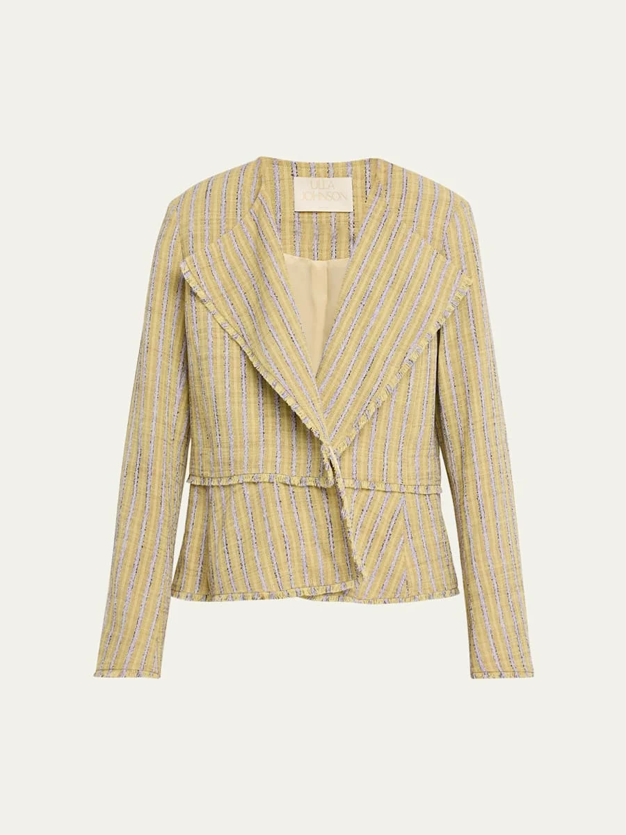 Ulla Johnson "Matteo" jacket crafted from Italian striped tailoring and finished with delicate eyelash fringe Wide shawl collar Long sleeves Tailored fit Hem sits at the hip Hidden front closure Cotton/viscose/polyester Dry clean only Imported