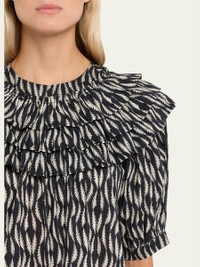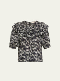 Ulla Johnson "Mira" blouse is crafted from an abstract printed cottonblend featuring puff sleeves and tiered ruffle along the neckline Crew neckline; fourbutton front Short puff sleeves; selftie cuffs Relaxed fit Pullover style Cotton/viscose Imported