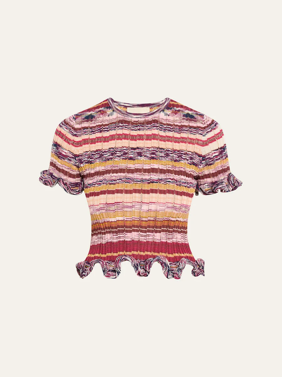 Ulla Johnson "Miya" multi-stripe ribbed knit top finished with ruffle trim Crew neckline Short sleeves Fitted Hem sits at the hip Pullover style Rayon/cellulose acetate/cotton/Lycra xfit® spandex Dry clean Imported Online Inquiries: BGS21_T6PVF| Store Inquiries: #5021333