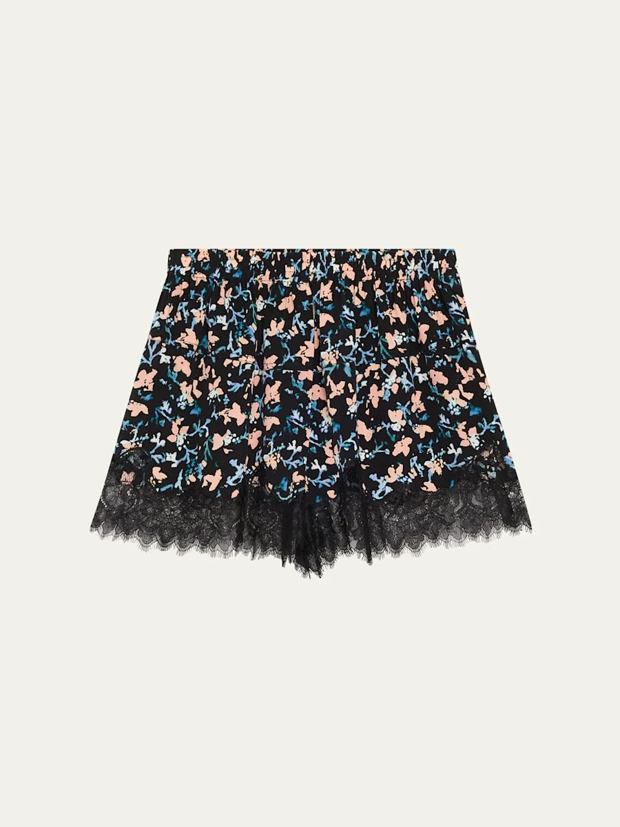 Ulla Johnson "Noella" floral-print silk shorts finished with a delicate lace hem High rise Elastic waistband Pleated front Flowy silhouette Pull-on style Silk Dry clean Imported Online Inquiries: BGS21_T6UHD| Store Inquiries: #5021341