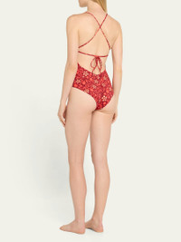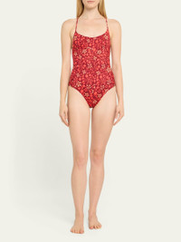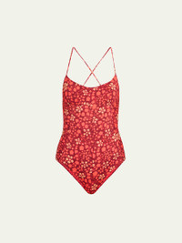 Ulla Johnson "Positano" one-piece swimsuit with crisscross back straps Scoop neckline Mid-back self-ties Moderate seat coverage Nylon/polyamide/elastane Fully lined Made in Portugal Online Inquiries: BGS21_T6FTV| Store Inquiries: #4976505