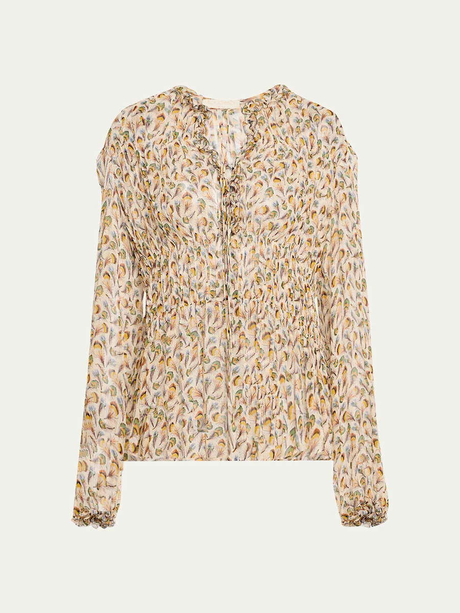 Ulla Johnson "Robbie" printed luxurious silk blouse finished with ruffle trim V neckline Long sleeves Classic fit Hem falls to the hip Tie-front Silk Dry clean Imported Online Inquiries: BGS21_T6YSA| Store Inquiries: #5060440