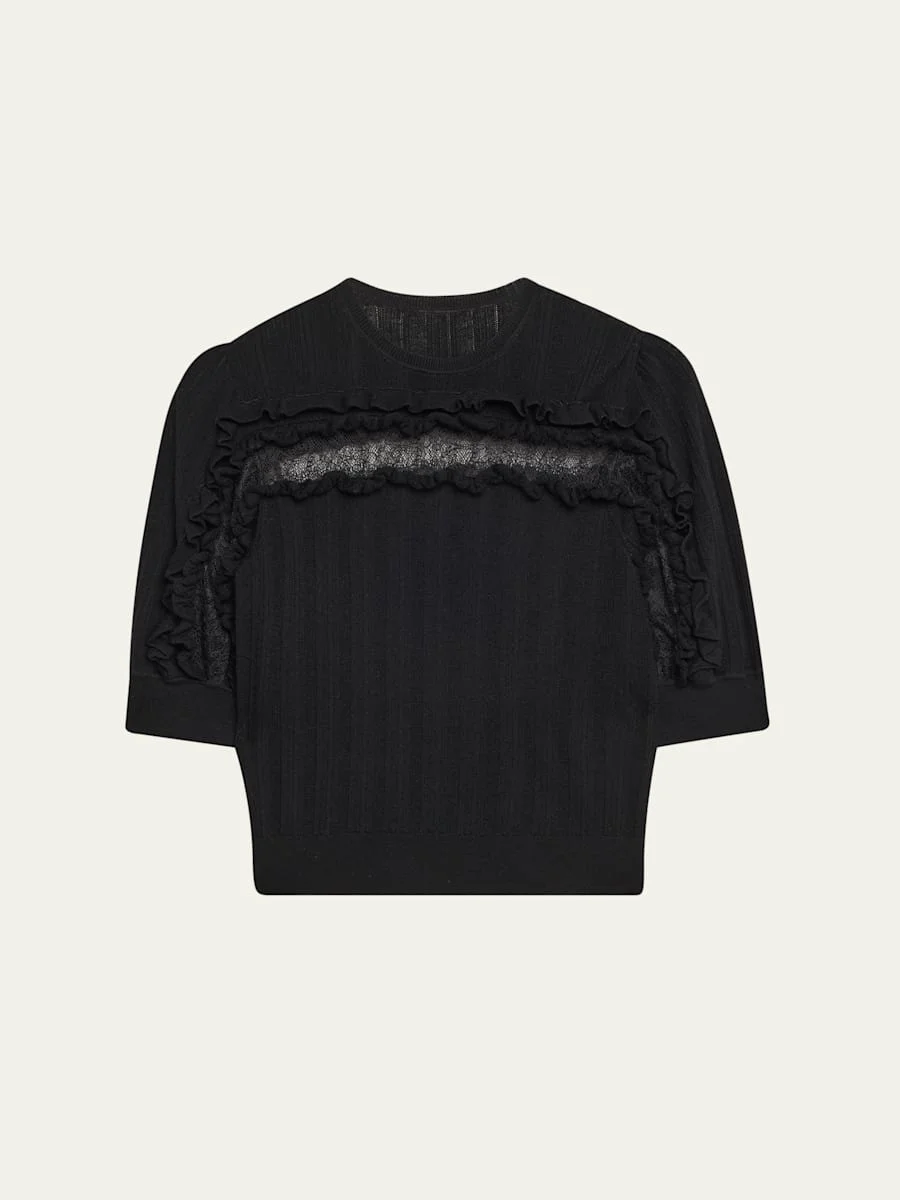 Ulla Johnson "Salima" lightweight merino knit shirt with ruffle detailing Crew neckline Short sleeves Classic fit Hem sits at the hip Pullover style Merino wool Imported Online Inquiries: BGS21_T6YR7| Store Inquiries: #5060396
