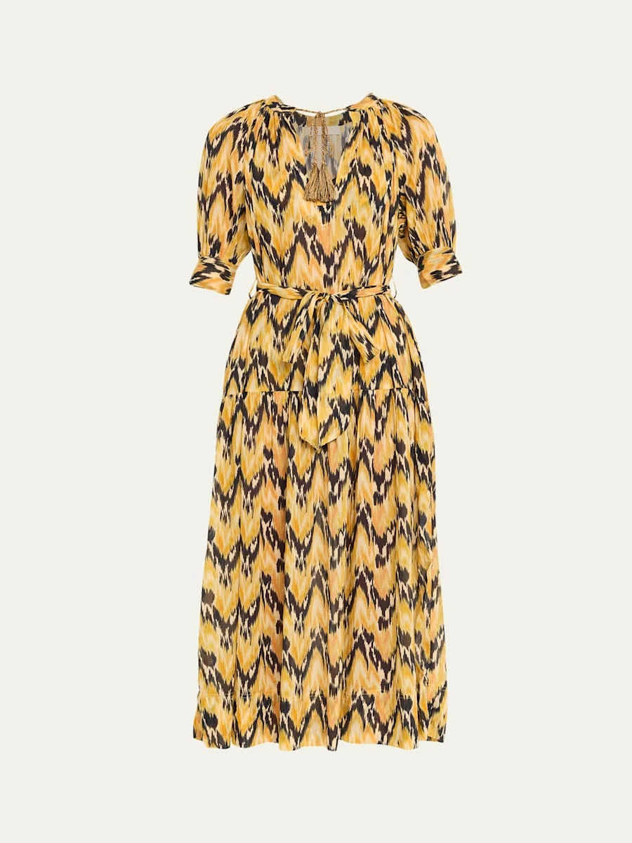 Ulla Johnson "Selena" printed maxi dress coverup adorned with tassel tie ends V neckline with optional self-ties Elbow-length puff sleeves; self-tie cuffs Self-tie sash belt Full length Slipover style Cotton Imported Online Inquiries: BGS21_T6NH8| Store Inquiries: #5021040