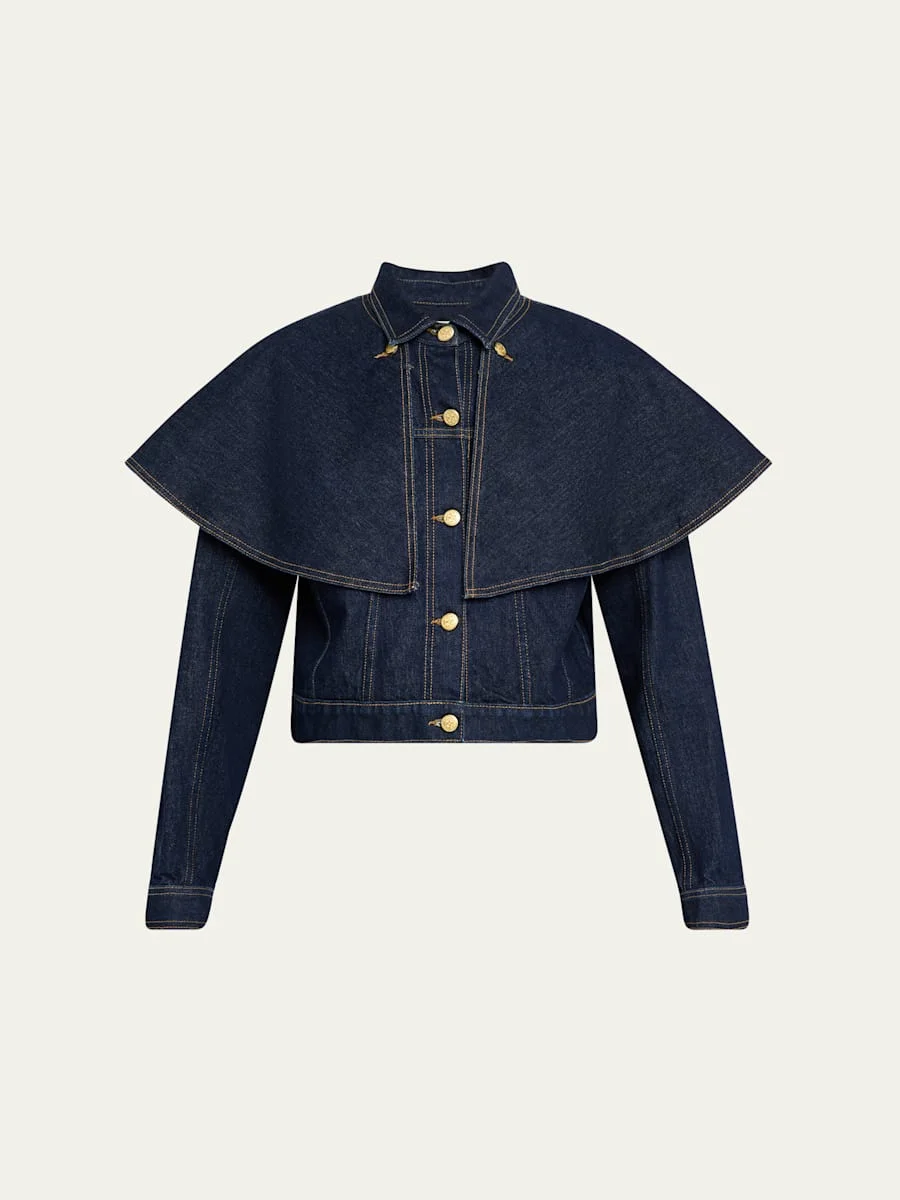 Ulla Johnson "The Agata" denim jacket enhanced with a detachable cape Point collar Long sleeves with button cuffs Classic fit Hem sits at the hip Button-front Cotton Made in USA Online Inquiries: BGS21_T6YWV| Store Inquiries: #5060468