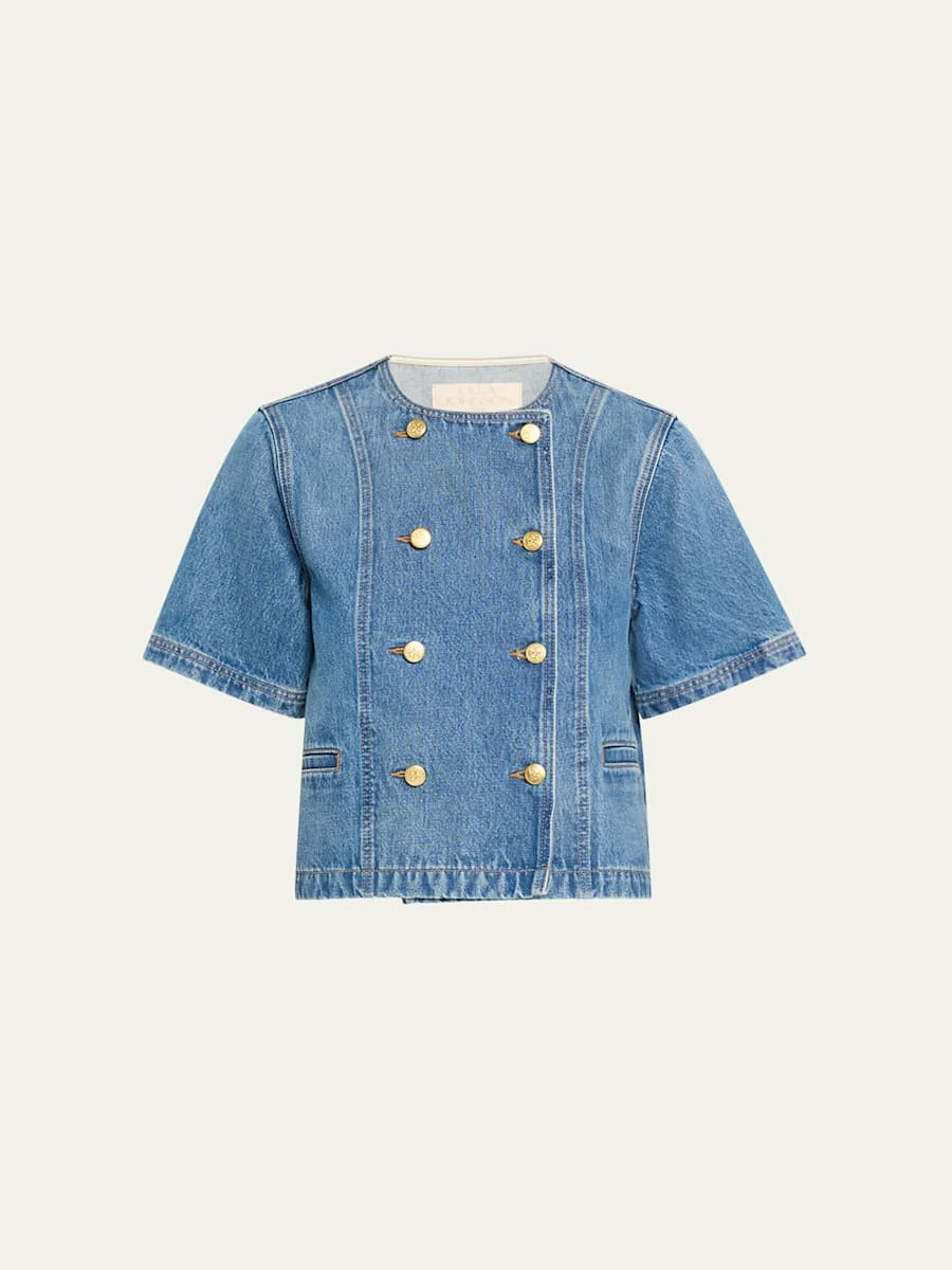 Ulla Johnson "The Serge" double-breasted jacket in medium-wash denim Round neckline Short sleeves; approx. 10.1"L Welt pockets Boxy fit Hem sits at the hip Button-front Cotton Machine wash cold Made in USA Online Inquiries: BGS21_T6PTZ| Store Inquiries: #5020984