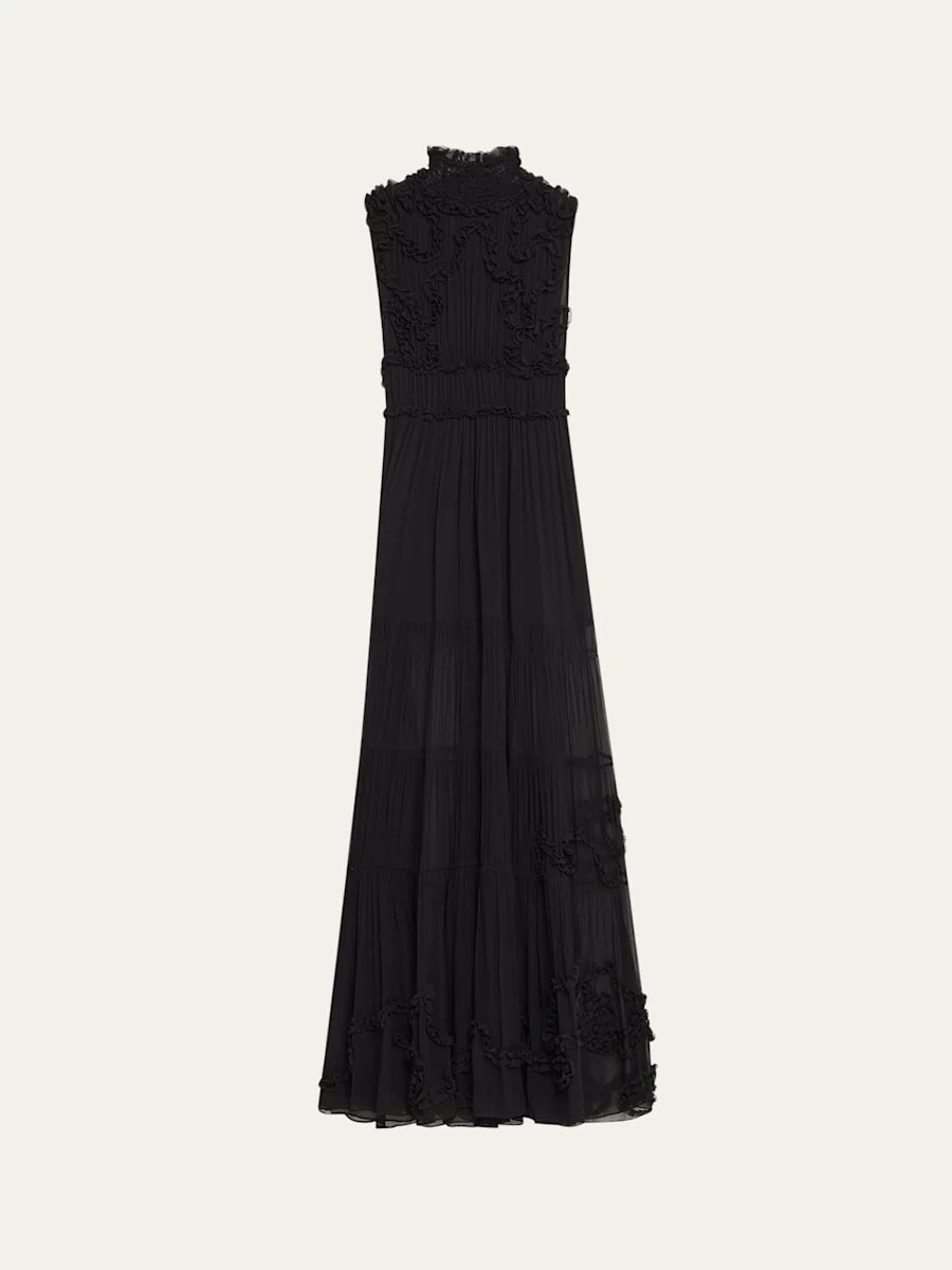 Ulla Johnson "Verona" smocked silk gown decorated with ruffle details throughout Turtleneck Sleeveless Column silhouette Full length Side zip Silk Dry clean Imported Online Inquiries: BGS21_T6YRG| Store Inquiries: #5060406