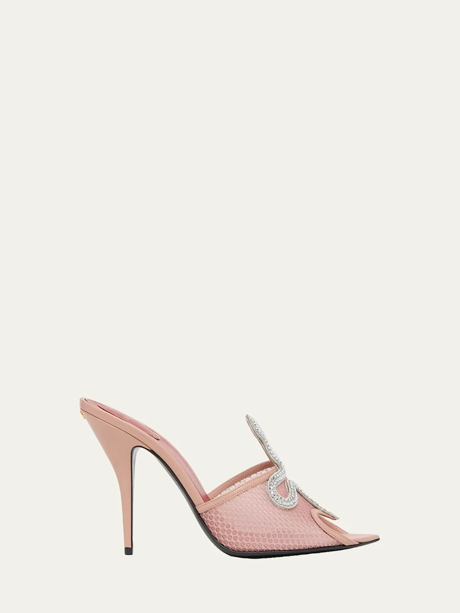 105mm Embellished Snake Leather Mesh Mule Pumps