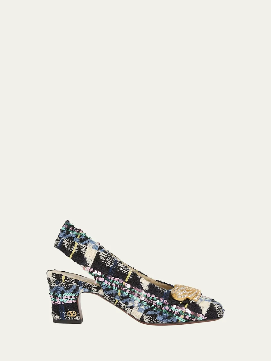 Valentino Garavani "Adamantine" pumps in sequinembellished tweed 2.36 in / 60 mm block heel Round toe Pave crystal ornament on toe Slingback strap Slipon style Leather lining and outsole Made in Italy