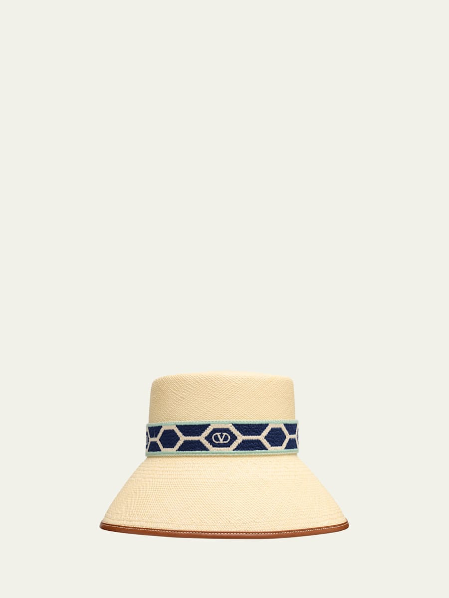 Valentino "Antibes" bucket hat in straw V-Logo signature metal detail in antique brass finish Jacquard embroidered ribbon with Diamond pattern Internal grosgrain ribbon Flat crown Downturned brim Straw Made in Italy Online Inquiries: BGS21_D51YD| Store Inquiries: #4893719