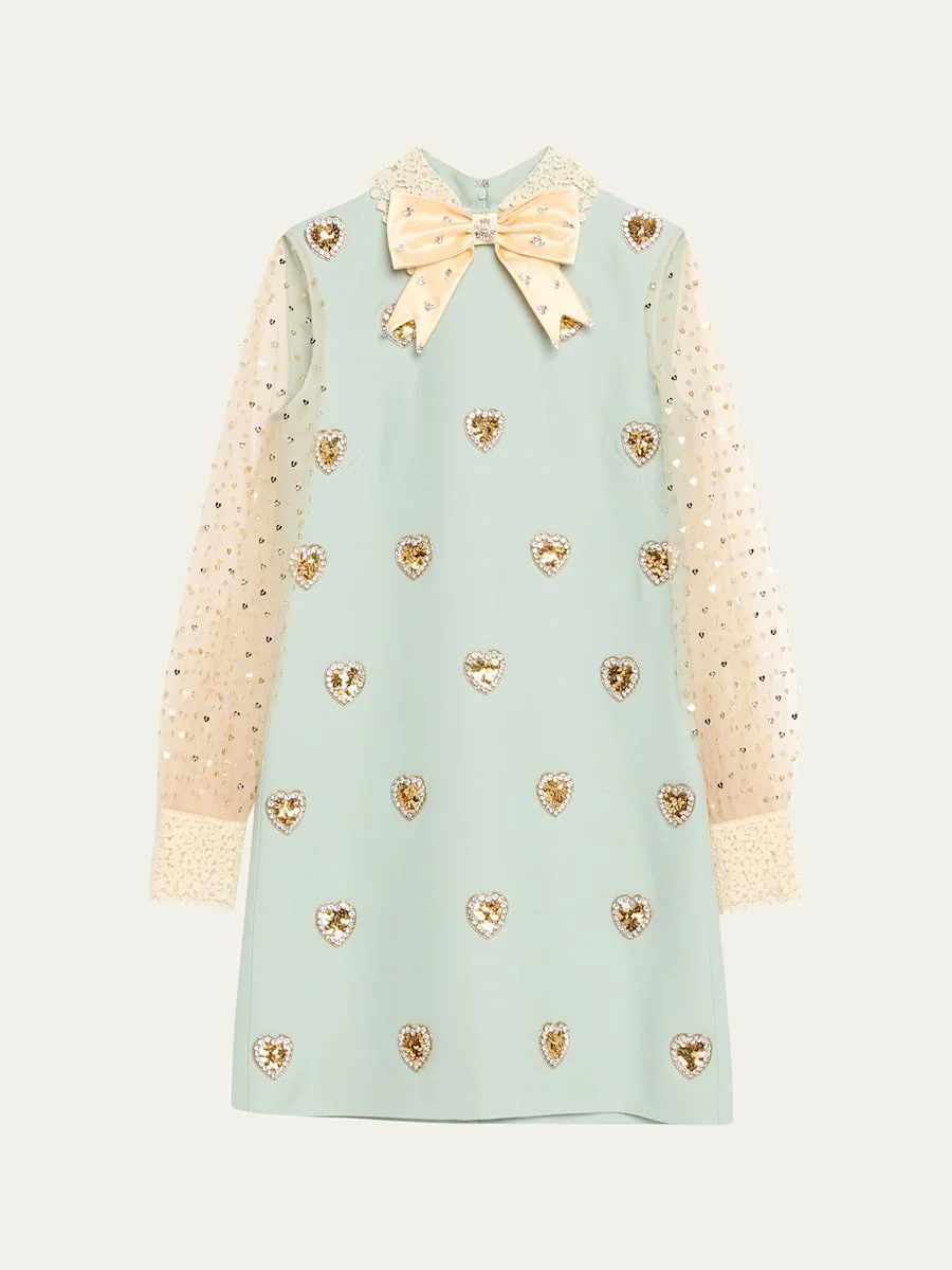 Bow Crystal Heart Sheer Sleeve Wool Mini Dress