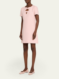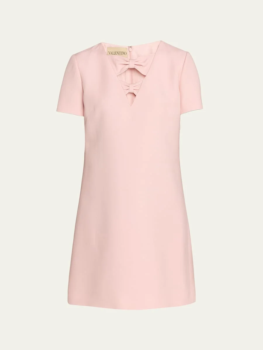Valentino Garavani dress is crafted of crepe featuring a bow inset chest cutout Round neckline; plunging illusion Short sleeves Shift silhouette Mini length Invisible back zip Virgin wool/silk Made in Italy
