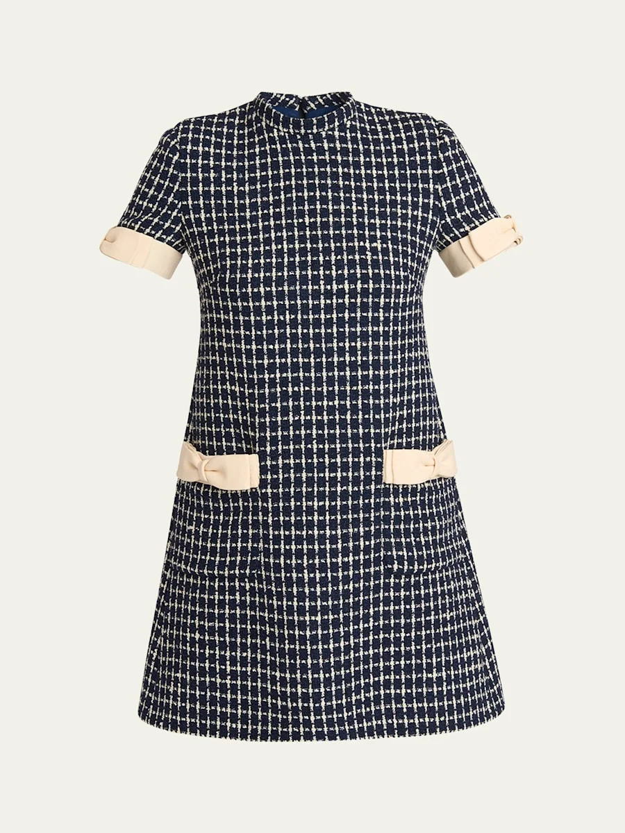 Valentino Garavani mini dress in grid-patterned boucle with solid trim and bow embellishments Mock neckline Short sleeves Front patch pockets Hem falls above the knee A-line silhouette Back zipper Virgin wool/cotton/nylon/polyamide Lining: Acetate/silk Made in Italy Online Inquiries: BGS21_B9XRP| Store Inquiries: #4995812