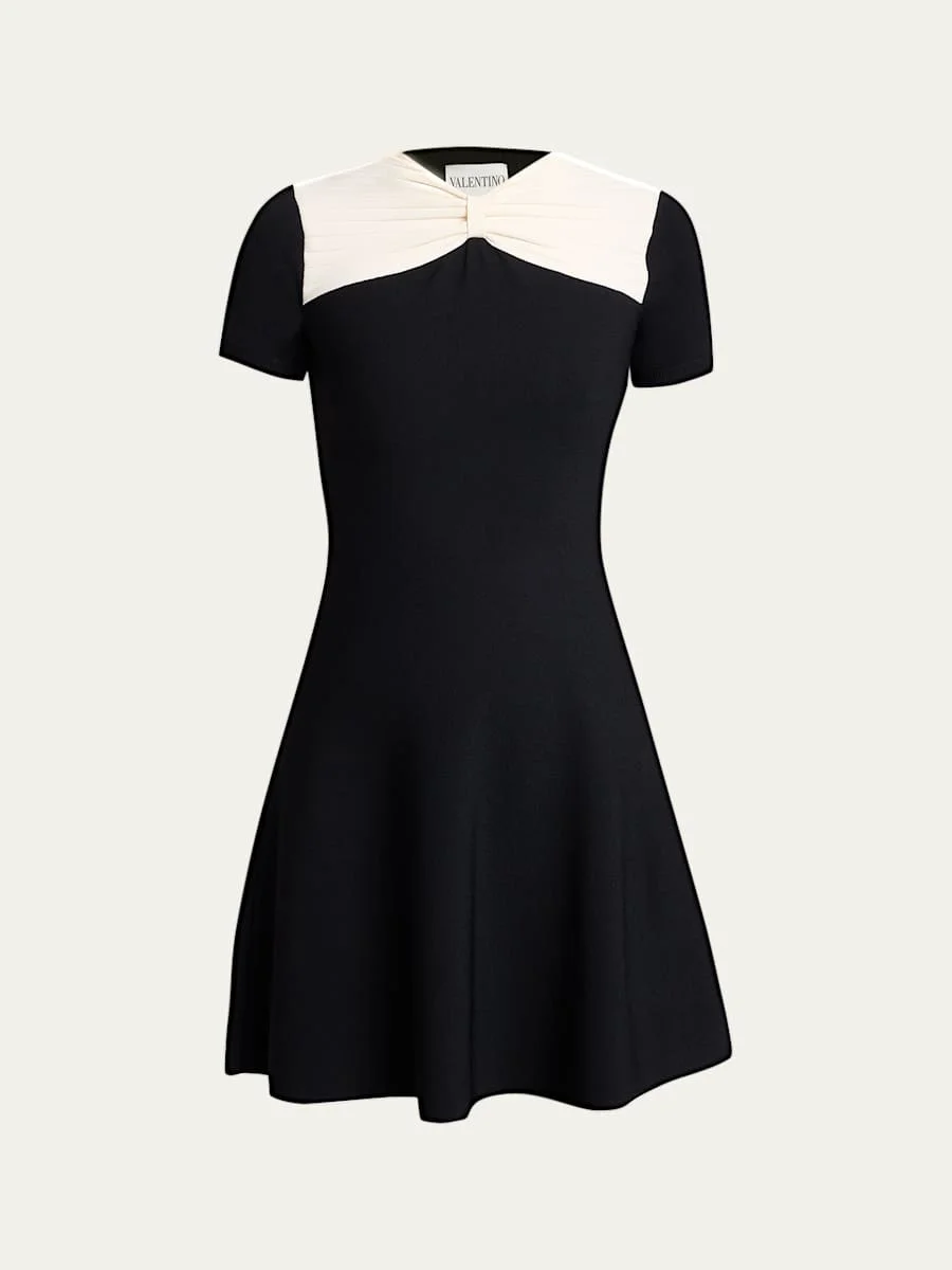 Valentino Garavani dress is crafted of a viscose-blend knit featuring a contrast pleated bow-like chest detail Round neckline Short sleeves A-line silhouette Mini length Slipover style Viscose/polyester Made in Italy Online Inquiries: BGS21_BAN7J| Store Inquiries: #5203595