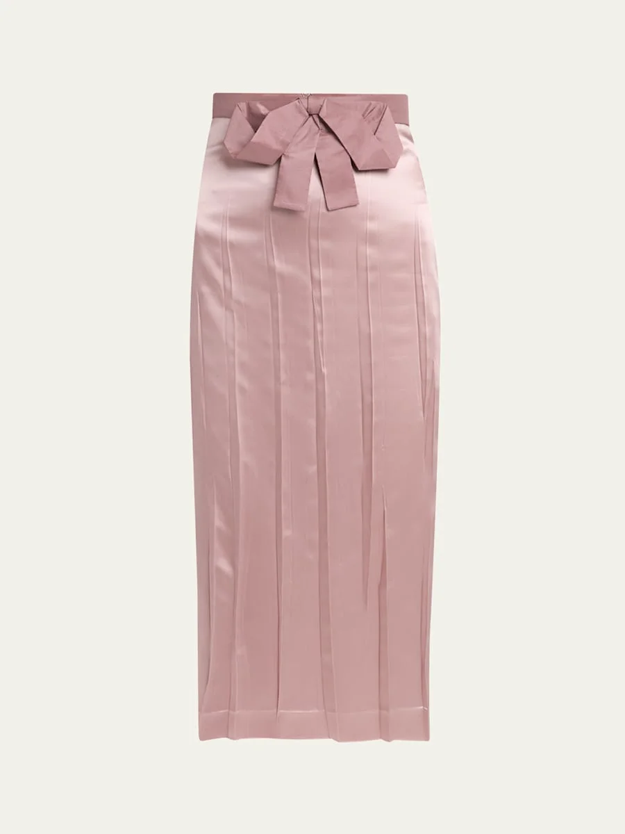 Valentino Garavani skirt finished in a pleated satin with a bow waist detail High waist Hem falls below the knee Skirt falls straight from hip to hem Walking vent back Back zip Acetate Made in Italy Online Inquiries: BGS21_BAZHT| Store Inquiries: #5357367