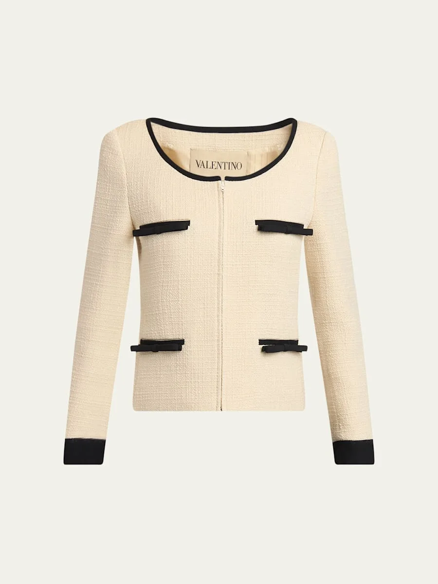 Valentino Garavani jacket tailored in a wool-blend tweed with contrast trim and bows Scoop neckline; zip front Long sleeves; button cuffs Padded shoulders Chest and hip welt pockets Slim fit Virgin wool/nylon/polyamide Made in Italy Online Inquiries: BGS21_BAZRC| Store Inquiries: #5358586