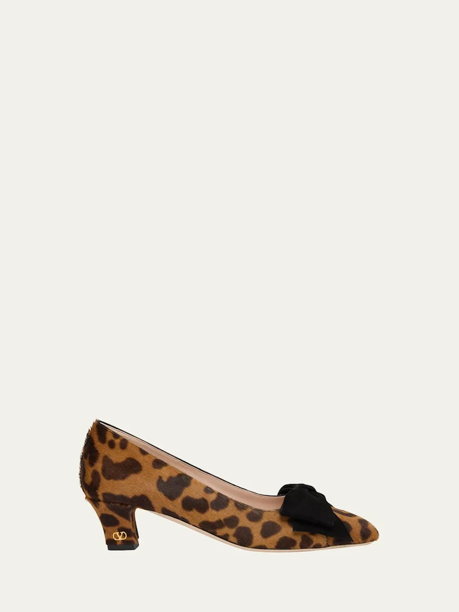 Valentino Garavani pumps in leopardprinted dyed calf hair (Italy) with a suede bow upper 1.75 in / 45 mm block heel Round toe Slipon style Leather outsole Lining: Leather Made in Italy