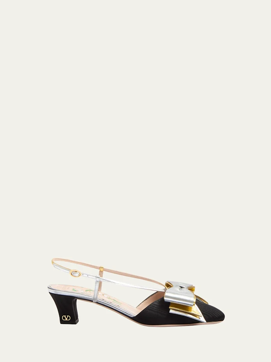 Valentino Garavani colorblock leather pumps with bow accent 1.75 in / 45 mm block heel Almond toe Anchored slingback strap Leather outsole Lining: Goat leather Made in Italy