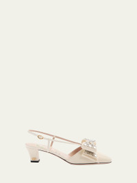 Valentino Garavani leather pumps with mirror and crystal embellished double bow accent 1.75 in / 45 mm block heel Almond toe Adjustable slingback strap Leather outsole Lining: Leather Made in Italy Size Note: Valentino Garavani shoes run small. Please order a 1/2 size larger than you typically wear. Online Inquiries: BGS21_X6QNV| Store Inquiries: #4888876