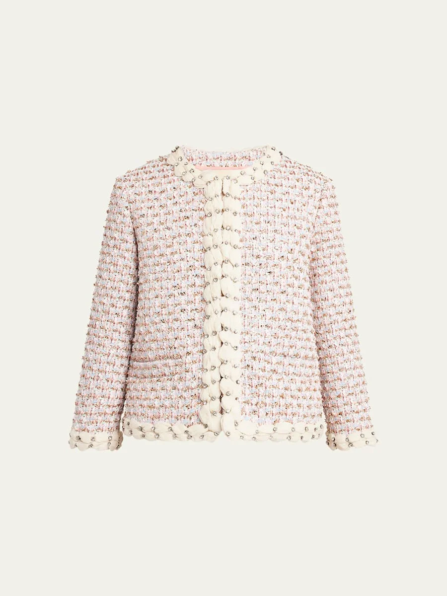 Valentino Garavani tweed jacket features puffy embroidered trim and crystal embellishments Crew neckline; hook front closure 3/4 sleeves Front welt pockets Boxy fit Nylon/polyamide/polyester/cotton Lining: Acetate/silk Made in Italy Online Inquiries: BGS21_B9XRM| Store Inquiries: #4995810