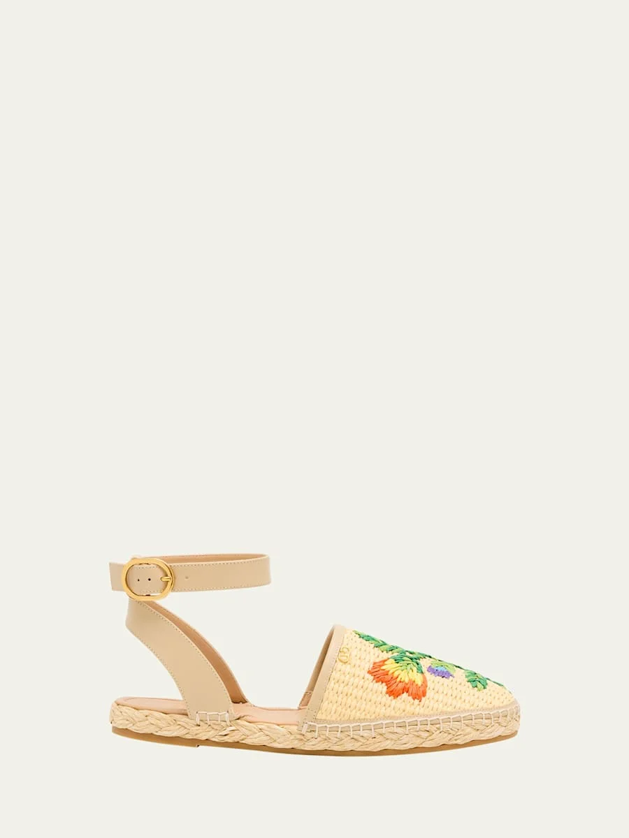 Valentino Garavani espadrille sandals in woven raffia with smooth leather trim and multicolored floral detailing Signature VLogo metal accent 0.25 in / 10 mm flat heel Round toe Elastic slingback strap Leather lining and outsole Made in Italy