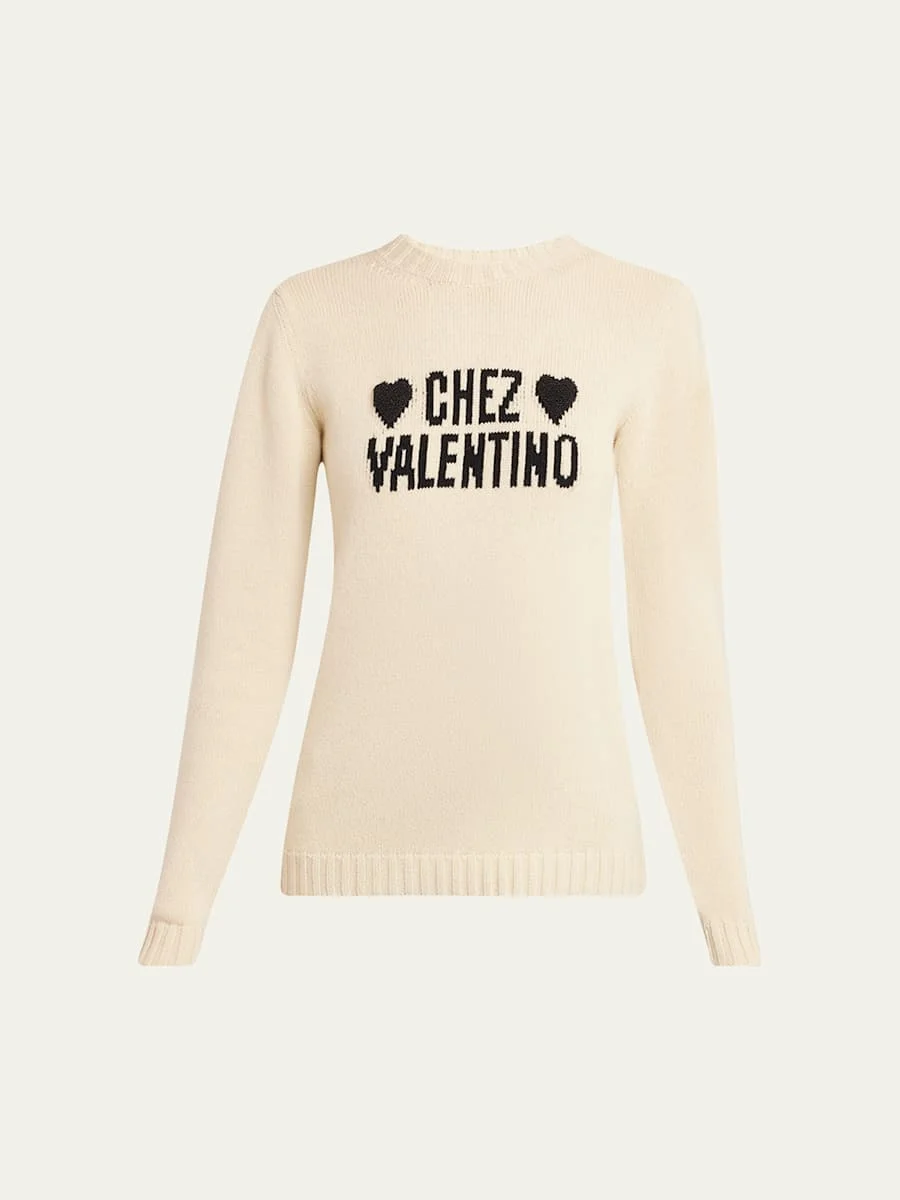 Valentino Garavani knit sweater features Chez Valentino contrast intarsia with bead embellishment across the chest Crew neckline Long sleeves Relaxed fit Pullover style Virgin wool Made in Italy Online Inquiries: BGS21_B9XQE| Store Inquiries: #4995783