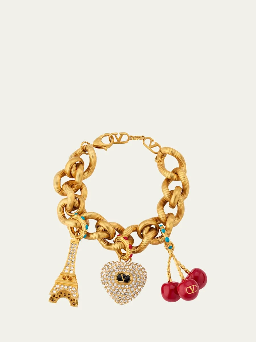 Valentino adds three playful charms to this large chain bracelet. Notice the Eiffel Tower, heart, and triple cherries charms, each adorned with the brand's signature Vlogo. Approx. 7" length; 2" charms Shiny gold-tone finish Enamel and Swarovski® crystals Swivel snap hook closure Made in Italy Online Inquiries: BGS21_Y7GXX| Store Inquiries: #5007013