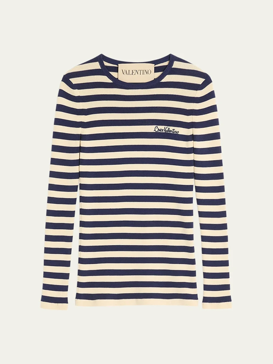 Valentino Garavani ribbed knit top featuring a striped intarsia and Chez Valentino embroidered chest Crew neckline Long sleeves Fitted Pullover style Cotton Made in Italy Online Inquiries: BGS21_B9XTA| Store Inquiries: #4996665
