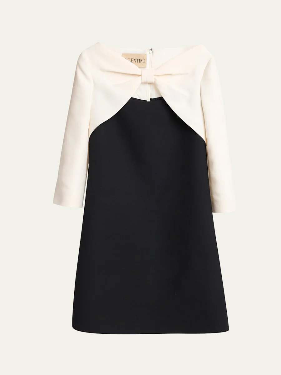 Valentino Garavani dress is crafted of wool-silk crepe featuring a contrast bow bolero-like chest detail with a keyhole cutout High neckline 3/4 sleeves A-line silhouette Mini length Invisible back zip Virgin wool/silk Made in Italy Online Inquiries: BGS21_BAN86| Store Inquiries: #5203855