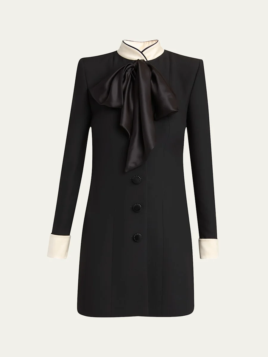 This tailored crepe couture dress by Valentino Garavani is fashioned with an oversized satin bow Contrasting collared neckline Padded shoulders Long sleeves; contrasting jewel button cuffs Hem hits around the knee A-line skirt Button front closure Virgin wool/silk Made in Italy Online Inquiries: BGS21_BAS1P| Store Inquiries: #5249500