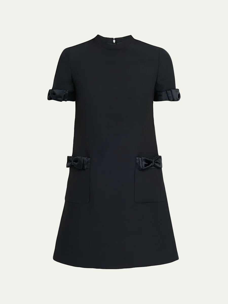 Valentino Garavani crepe couture dress with tonal bows in Double Duchesse on pockets and cuffs Funnel neckline Short sleeves Hem falls above the knee Shift silhouette Patch pockets Back zip Virgin wool/silk Lining: Silk Made in Italy Online Inquiries: BGS21_BB27U| Store Inquiries: #4995780