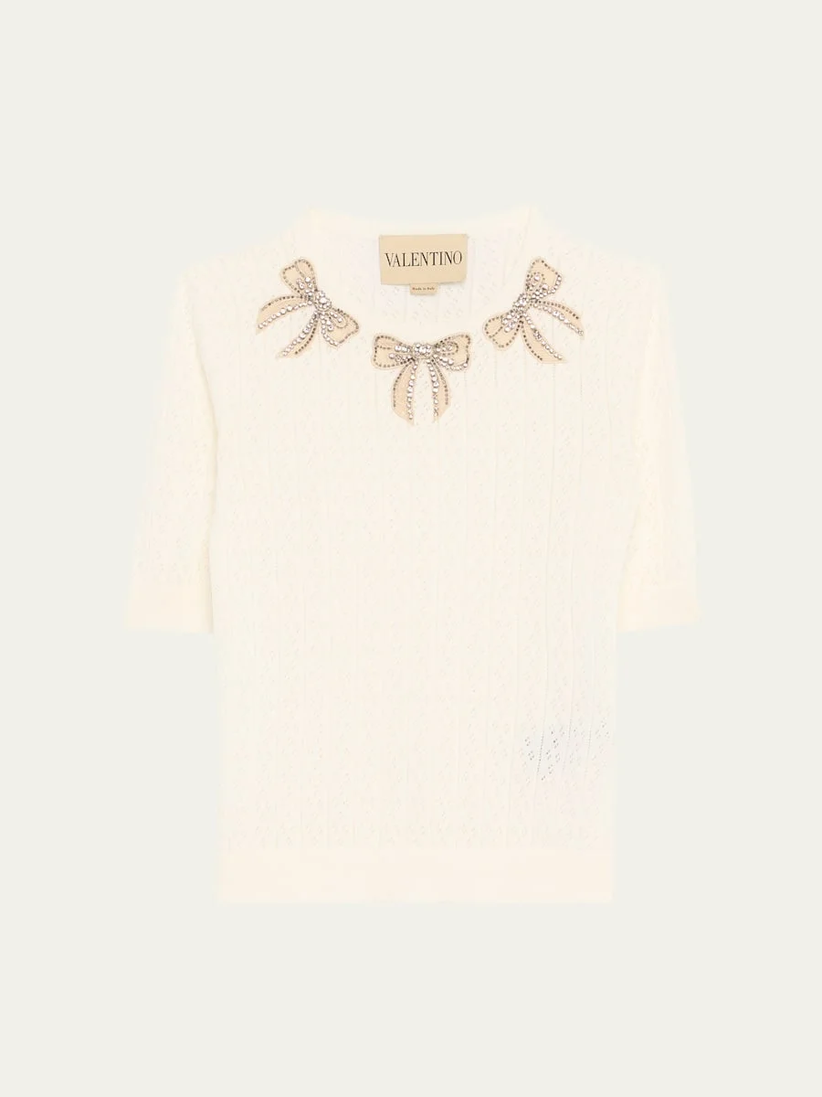 Valentino Garavani pointelle knit top featuring crystal-embellished lace bows along the collar Crew neckline Elbow sleeves Fitted Ribbed cuffs and hem Pullover style Cotton Made in Italy Online Inquiries: BGS21_B9XTD| Store Inquiries: #4996669