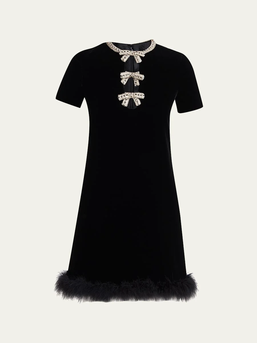 Crystal Bow Velvet Mini Dress With Feather Trim